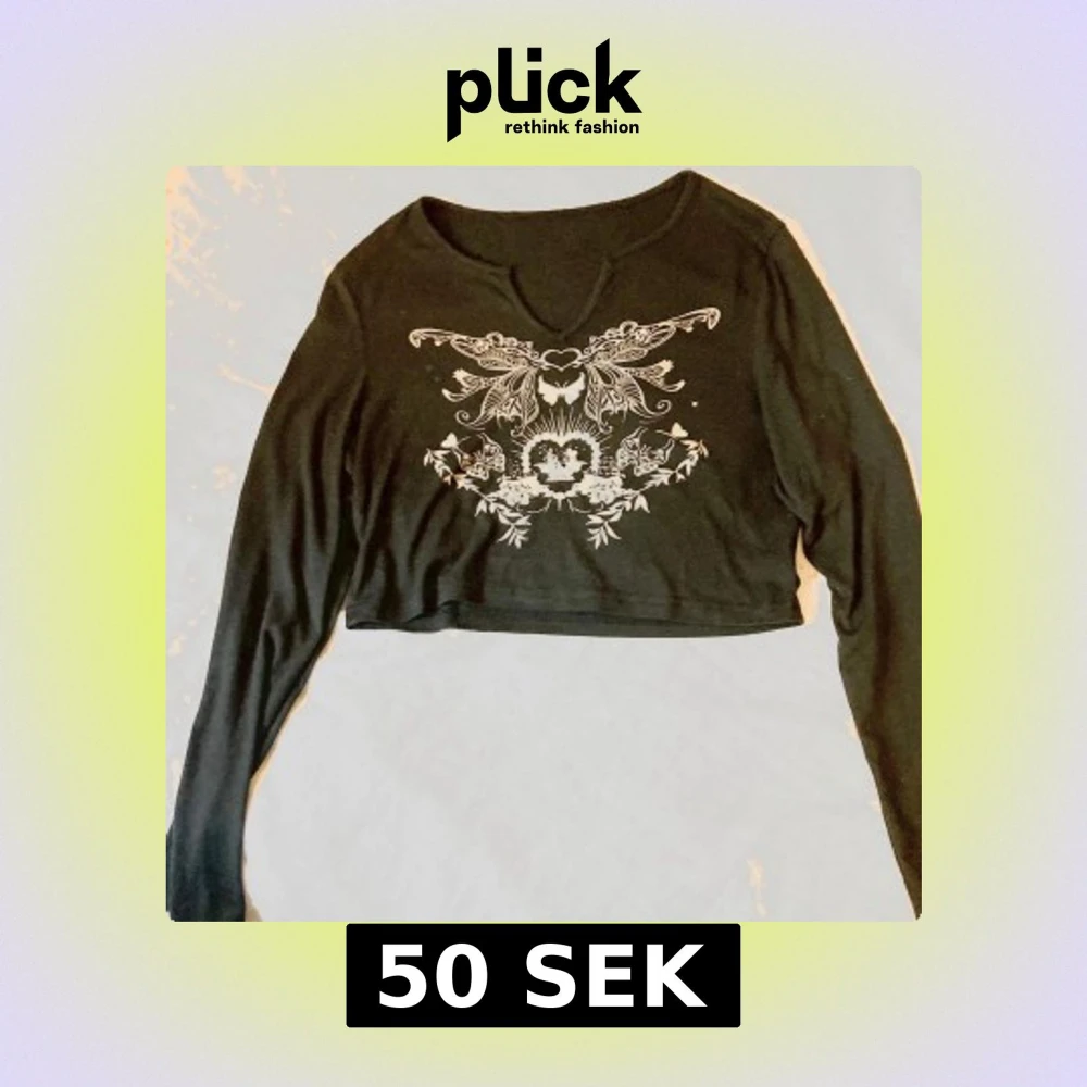 Svart croppad långärmad topp med snyggt vitt tryck framtill som har fjärilar, hjärtan och blommor i ett symmetriskt mönster. Toppen har en liten v-ringning och sitter tight över kroppen. Perfekt för dig som gillar alternativ stil/y2k/ soft-goth(?). Står att den är strlk L men sitter mer som XS-S-M, stretchigt material dock. Endast använt några fåtal gånger
