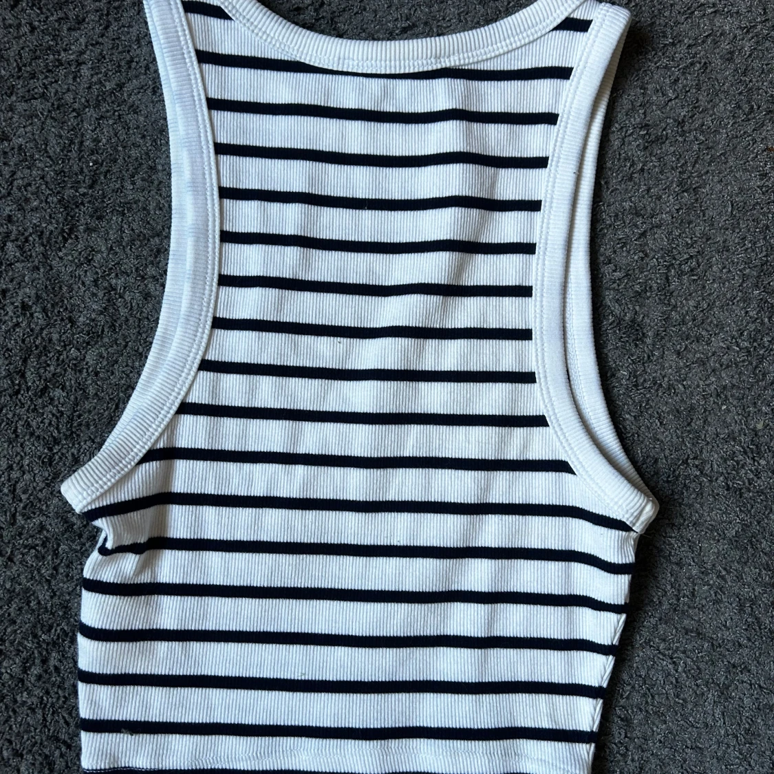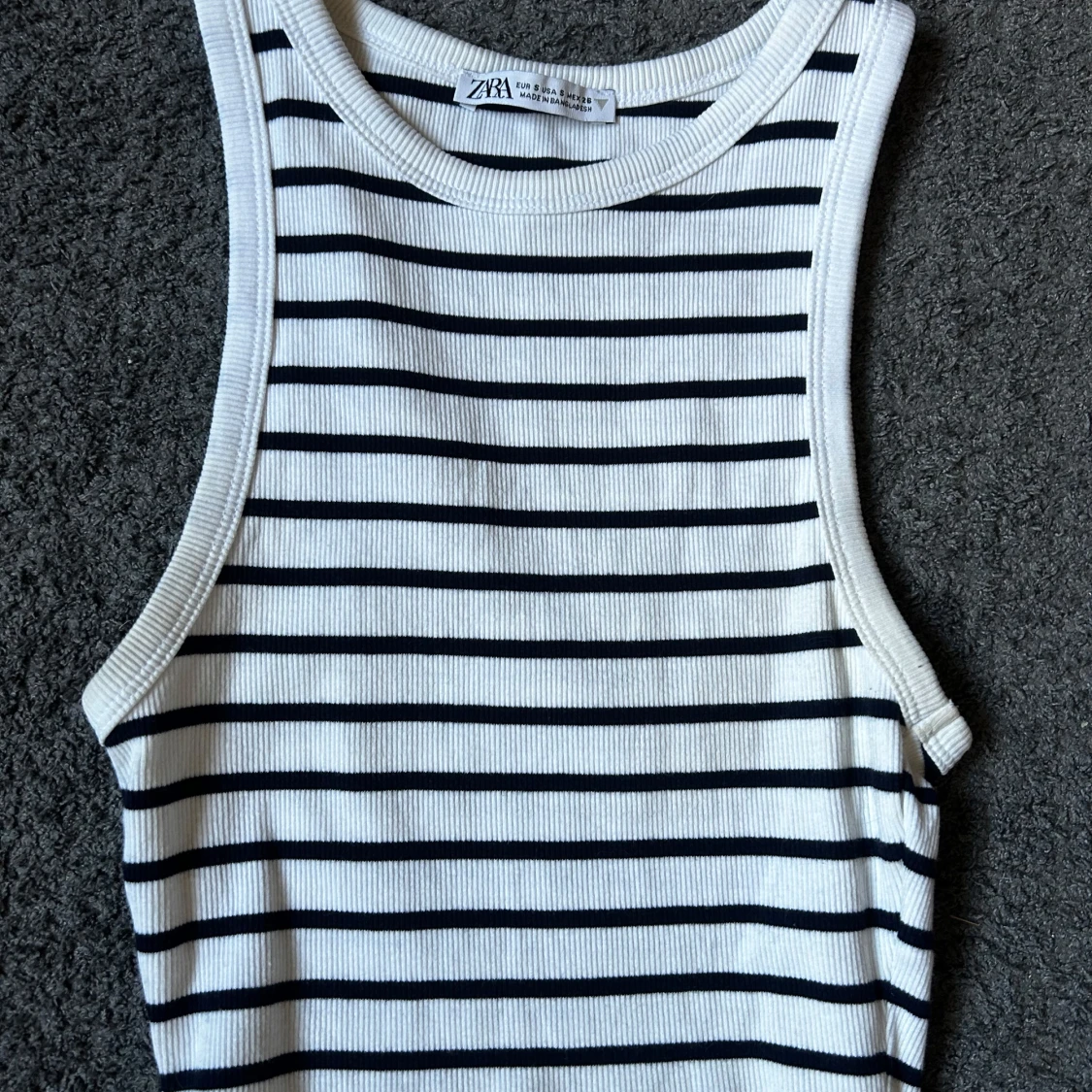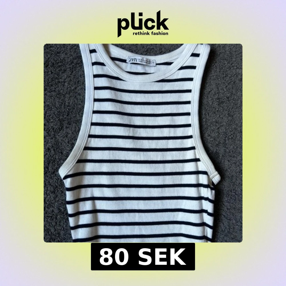 Säljer en vit och svart ribbad linnetopp från Zara i storlek S. Toppen har smala svarta horisontella ränder, är ärmlös och har en croppad passform. Perfekt för varma dagar och enkel att matcha med jeans eller kjol. Endast använd ett fåtal gånger, säljer då den är för stor för mig.❤️