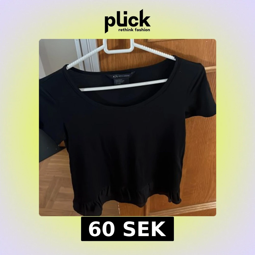 en svart topp från Armani Exchange i storlek xs. korta ärmar, rund halsringning och volangdetalj längst ner. mjukt och lätt material perfekt inför sommaren