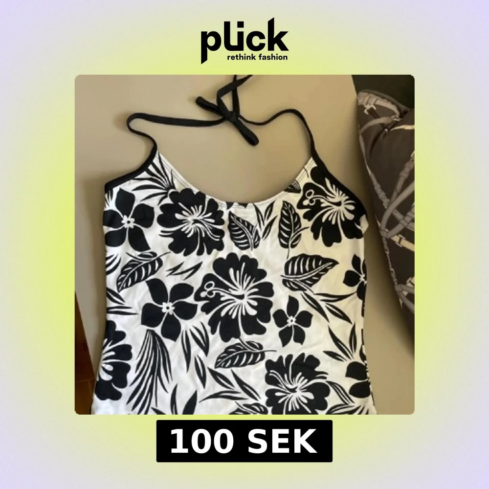 Snygg svartvit halterneck-topp med blommigt mönster. Perfekt för sommardagar med sitt lätta och luftiga material. Den har en knytning i nacken och en stilren design som passar till många olika outfits.