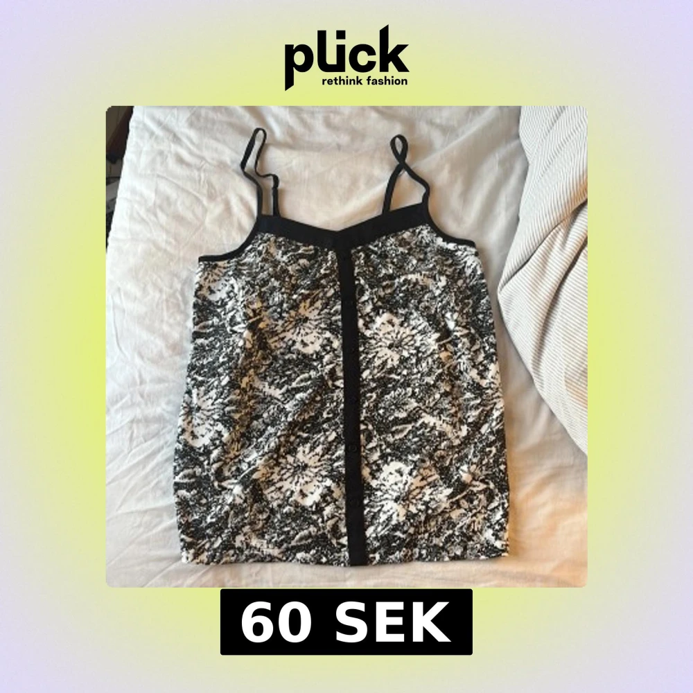 Säljer en snygg svartvit mönstrad linnetopp från Vero Moda. Toppen har smala axelband och knappar fram! Storleken är XS men skulle passa S/M också