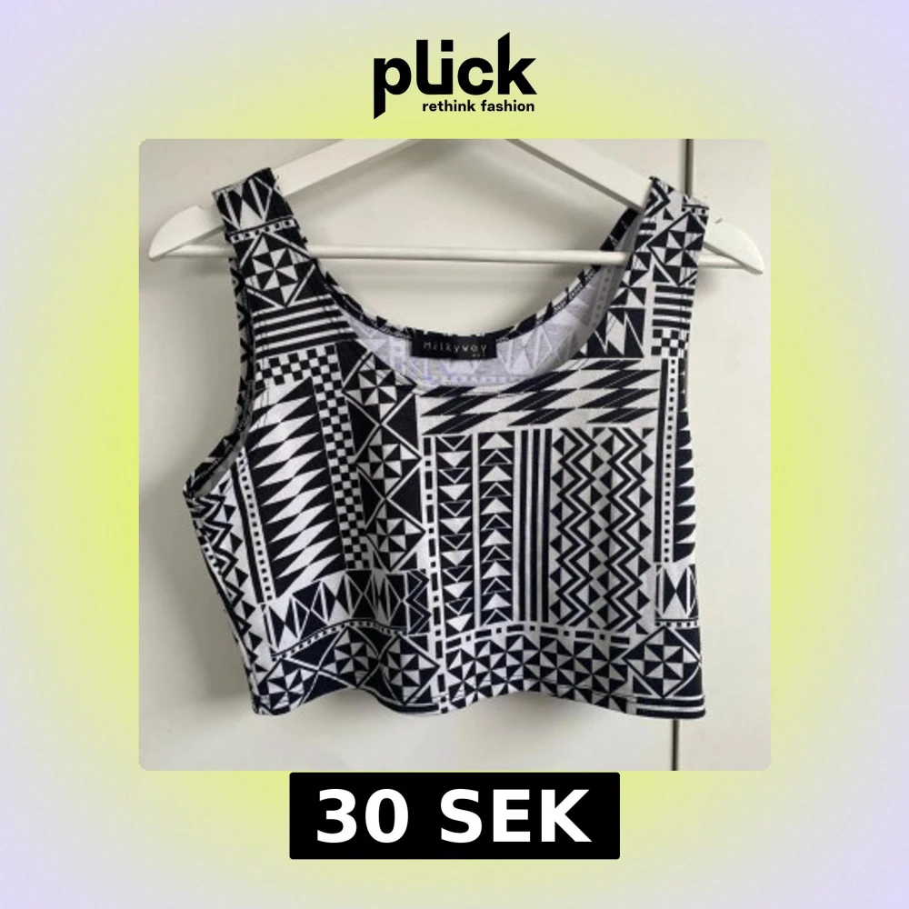 Snygg croppad topp från Milkyway med svartvitt geometriskt mönster. Toppen är ärmlös och har rund halsringning. Perfekt att styla med höga jeans eller kjol för en cool look. Står ingen storlek men skulle säga S/M. Köpt i USA.