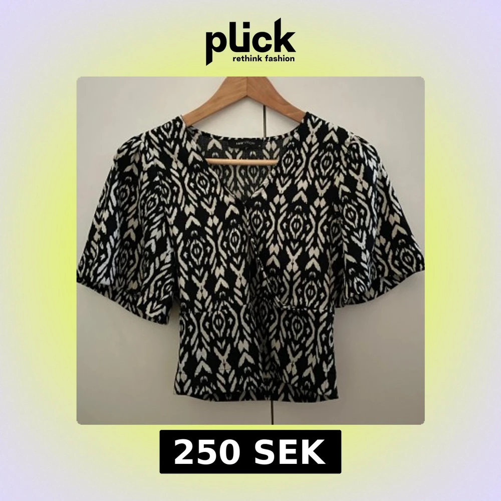 Säljer en snygg svartvit mönstrad topp. Toppen har korta ärmar och en v-ringad design som ger en stilren look. Perfekt för att piffa upp garderoben! Har använt några gånger men är i perfekt skick den är lite öppen där framme men jag brukar nåla om man inte vill att den ska vara så öppen 💗