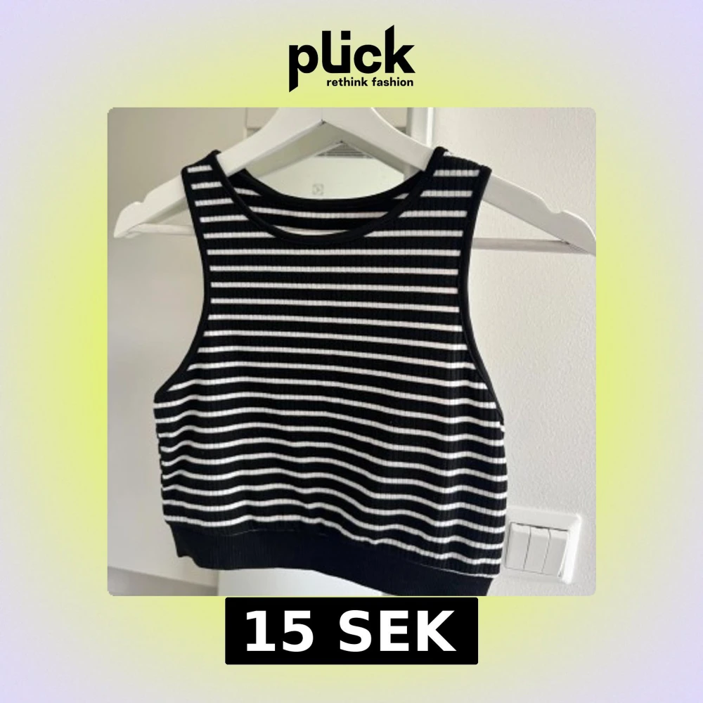 Säljer en croppad linnetopp med svarta och vita horisontella ränder. Toppen är ribbad och ärmlös med rund halsringning 🌸