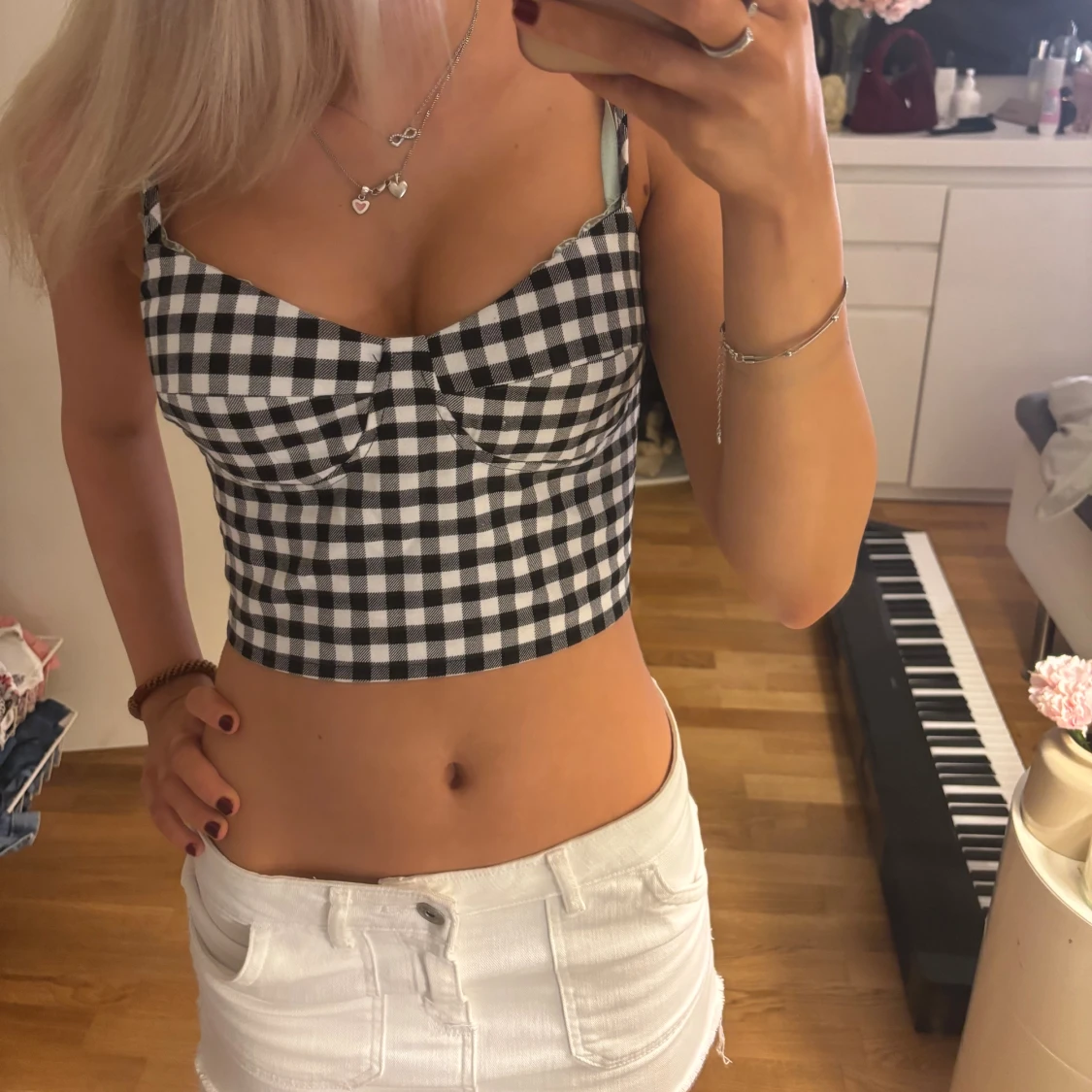 Säljer en croppad topp med svart vitt rutigt mönster!! Super snygg och perfekt till fest!