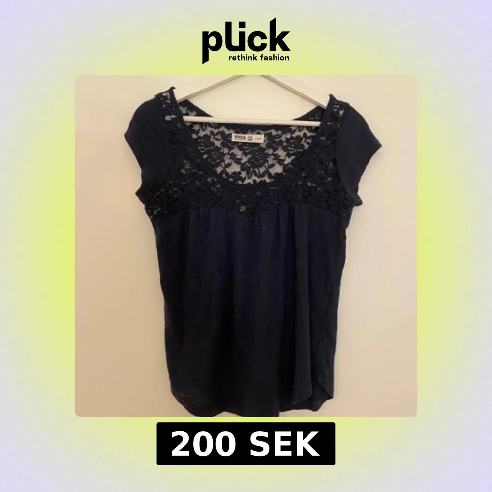 Supersöt mörkblå blus från Svea med vacker spets upptill och korta ärmar. Blusen har rund halsringning och ett romantiskt blommigt spetsmönster över axlar.