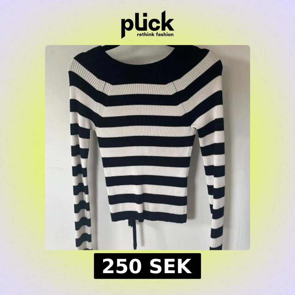 Säljer en svartvit ribbad topp från Zara med breda ränder och lång ärm. Toppen har snygg öppen rygg med snörningsdetalj som knyts baktill. Figurnära passform och stretchigt material, perfekt till jeans eller kjol.😌