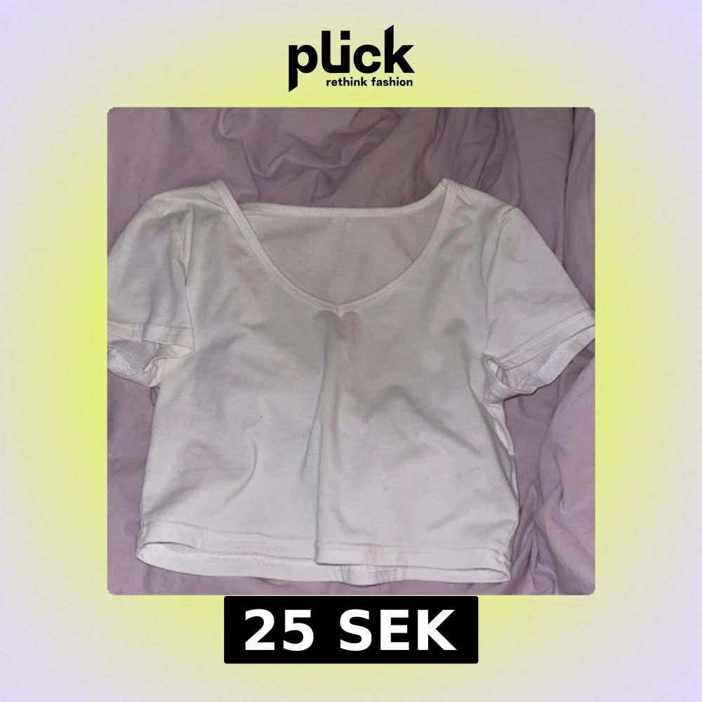 Säljer en enkel och stilren vit croppad t-shirt med korta ärmar och v-ringning. Perfekt för en avslappnad look.
