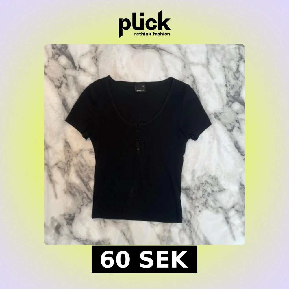 En svart, ribbad topp från Gina Tricot med korta ärmar och rundad halsringning. Toppen har tre knappar framtill som ger en snygg detalj.
