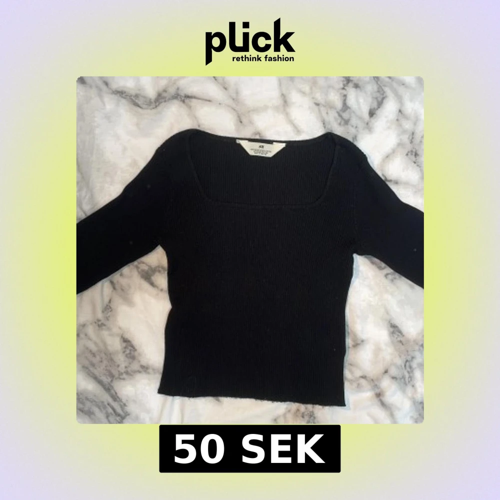 En svart ribbad topp från H&M med fyrkantig ringning och lång ärm. Toppen är figurnära och har en enkel, stilren look som passar perfekt till jeans eller kjol. Materialet är stretchigt och bekvämt, vilket gör den lätt att bära hela dagen.