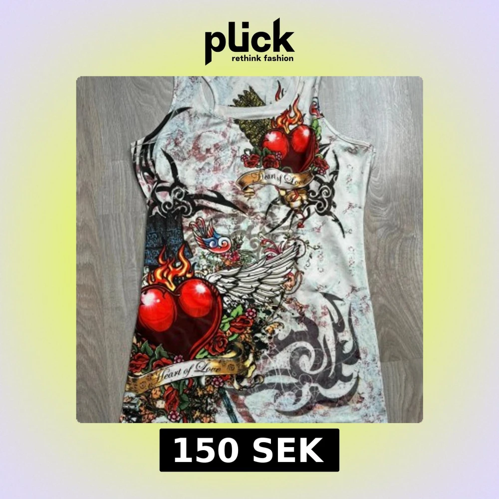 Snygg linnetopp från Club L med tattoo-inspirerat tryck i rött, svart, blått och gult. Motiv med brinnande hjärtan, vingar, rosor och texten 'Heart of Love'. Topp i figurnära modell, perfekt för dig som gillar statement-plagg.
