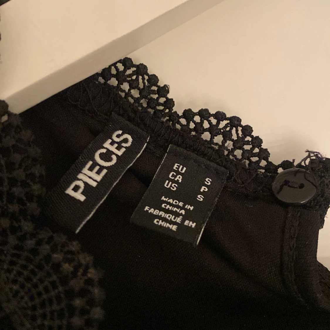 Snygg svart blus från Pieces med vackra spetsdetaljer. Perfekt för en elegant look. Blusen har korta ärmar och en rund halsringning.
