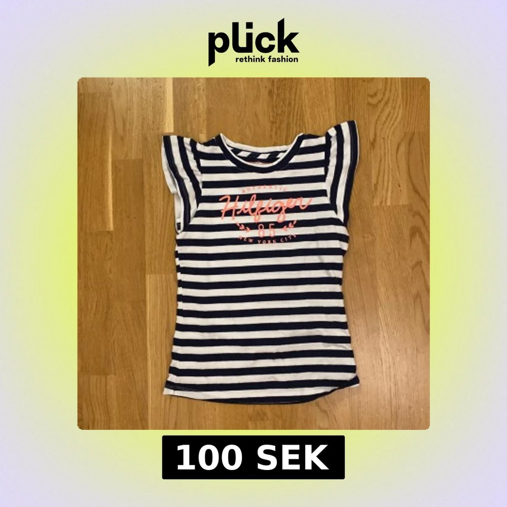 Snygg randig topp från Tommy Hilfiger i marinblått och vitt med rosa tryck framtill. Modellen är ärmlös med volangliknande axlar och rund halsringning. Stlk 12/14 år motsvarande XS