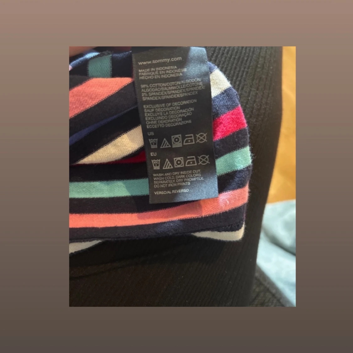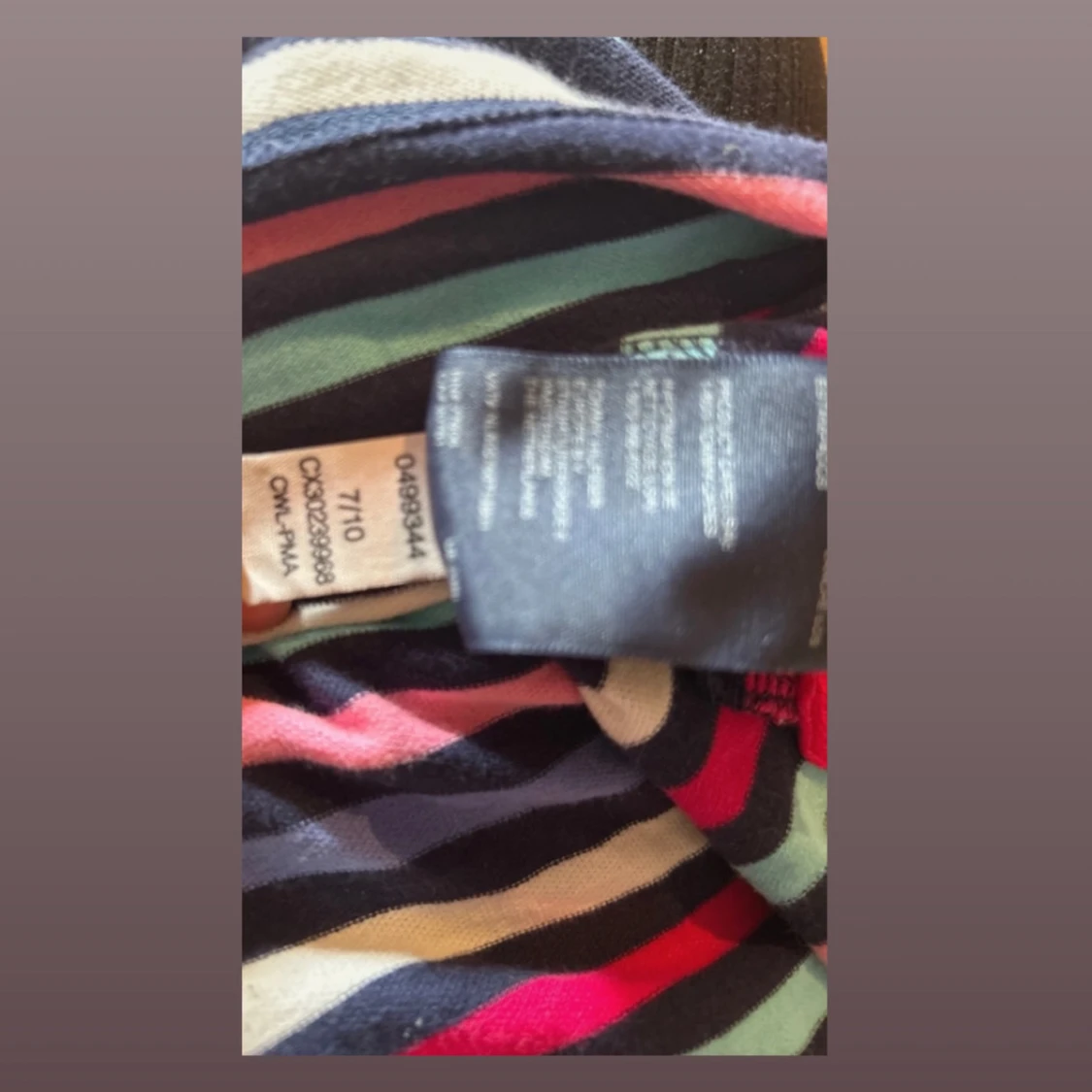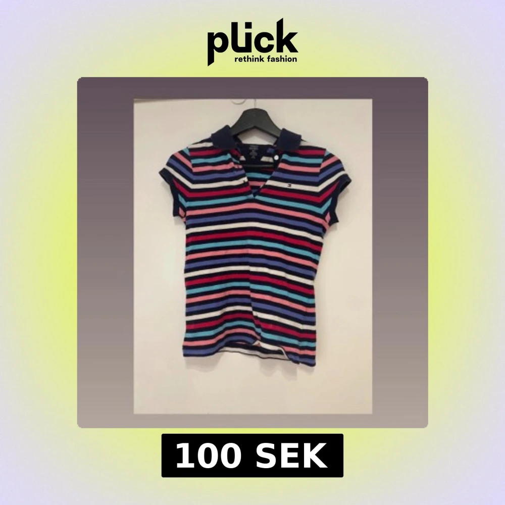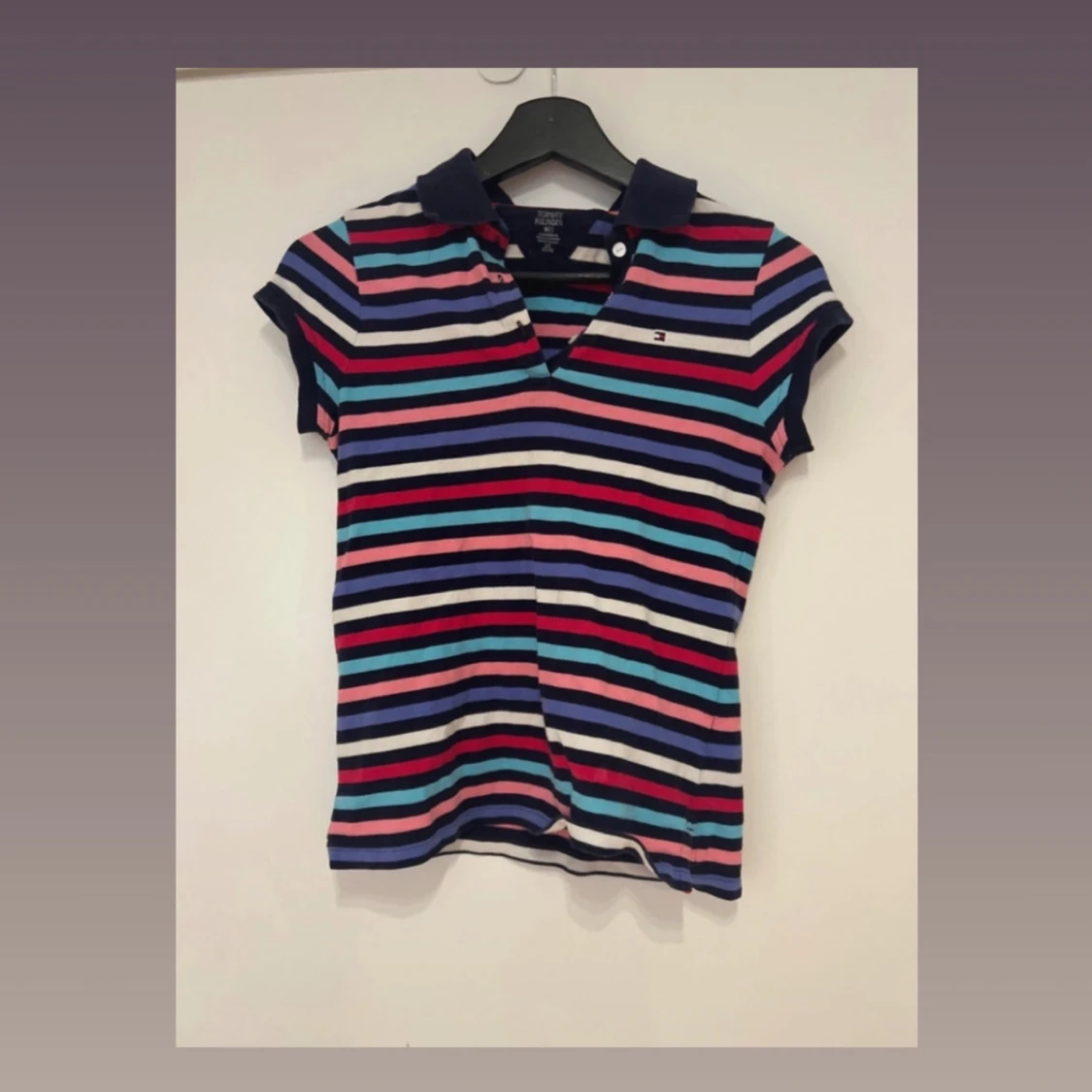 Säljer en färgglad randig pikétopp från Tommy Hilfiger med korta ärmar och klassisk krage. Toppen har marinblå, röd, rosa, vit, blå och lila ränder samt liten logga på bröstet.