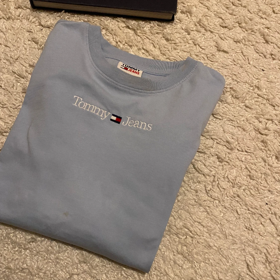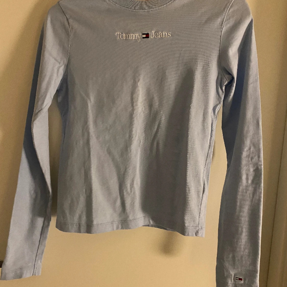 Tommy Hilfiger tröja i nyskick! Använd fåtal gånger så som ny! Storlek s dam Tunnare material och härlig nu till våren, superfin ljusblå färg🥰💙