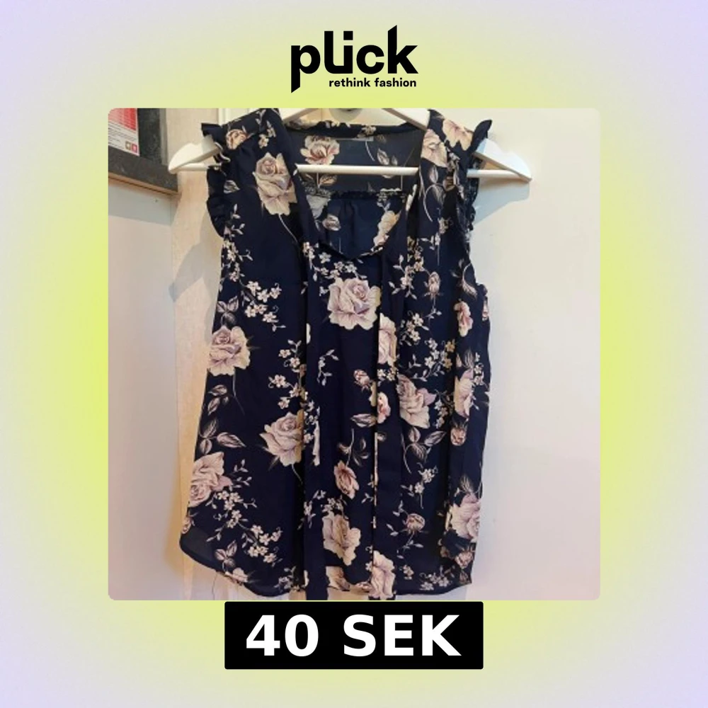Supersöt blommig blus från Hallys i marinblått med ljusa rosor och småblommor. Ärmlös modell med volangdetaljer vid axlarna och knytband framtill. Luftigt material storlek xs