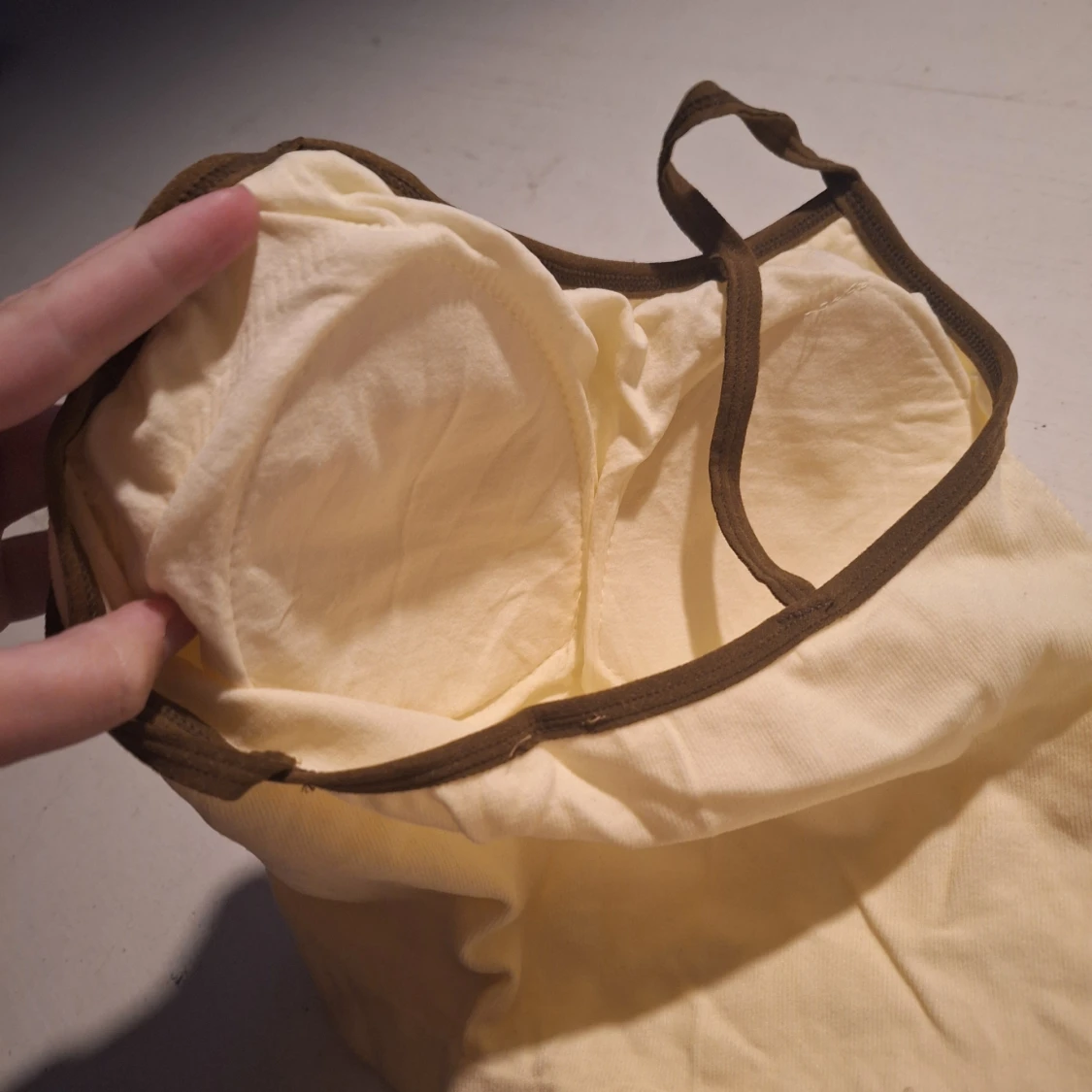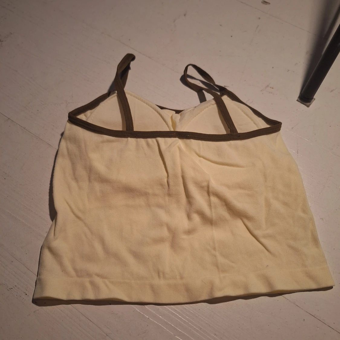 Säljer en gul linne med brunt tryck 'Hawkins Middle School 1983'. Den har smala axelband och bruna kanter. Perfekt för en avslappnad stil. Den har även inbyggda inlägg.