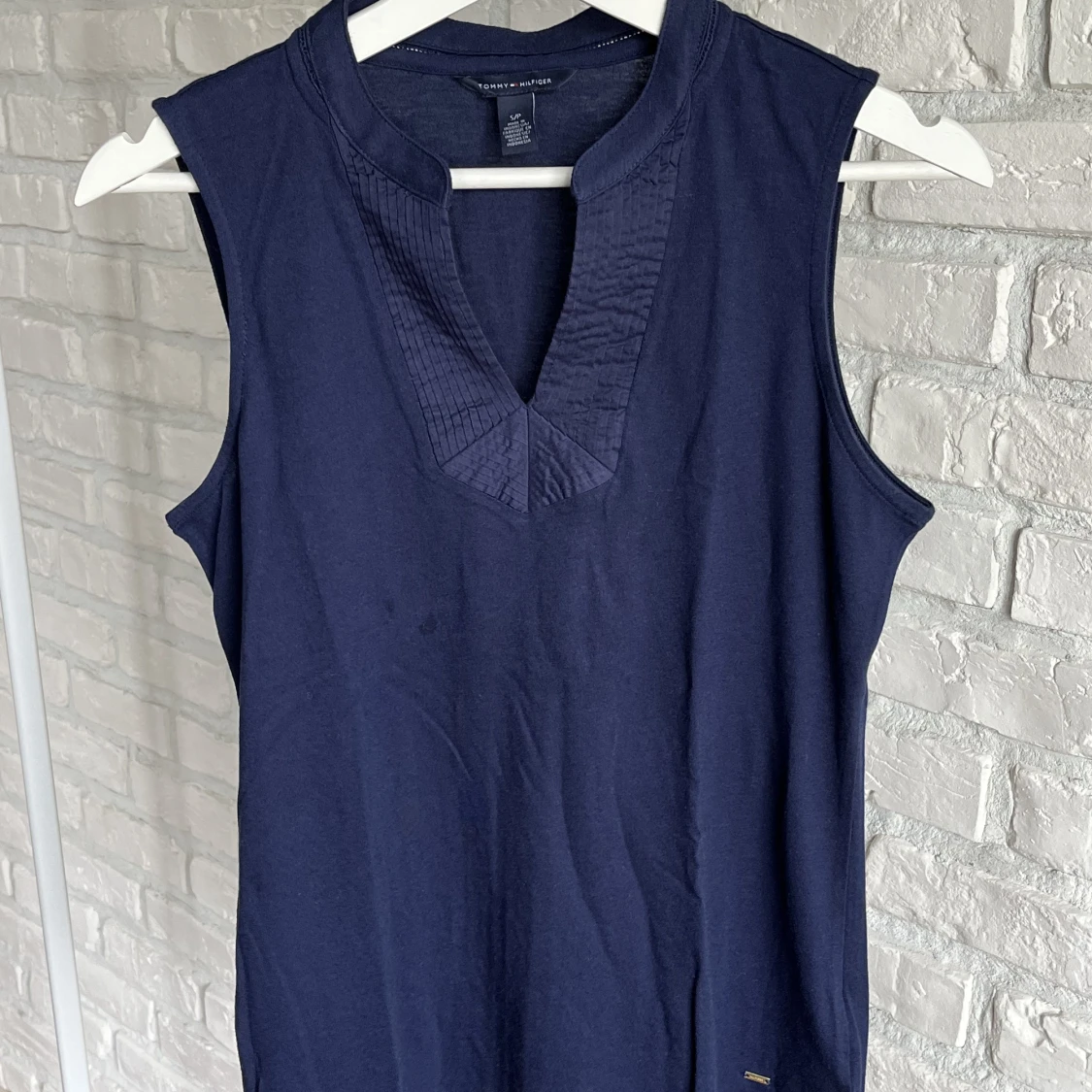 Marinblå Tommy Hilfiger top utan ärmar med delaj runt v ringningen.