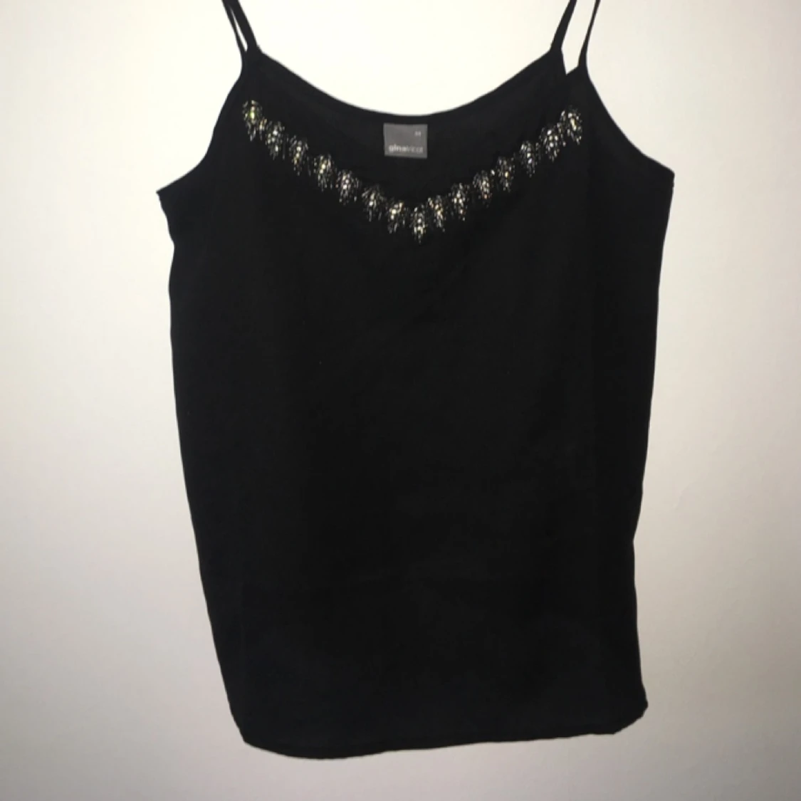 Väldigt fint linne. Funkar lika bra på festen som i veckan. Vanligt svart, men med väldigt snygg detalj i urringningen. Köparen får stå för frakten.