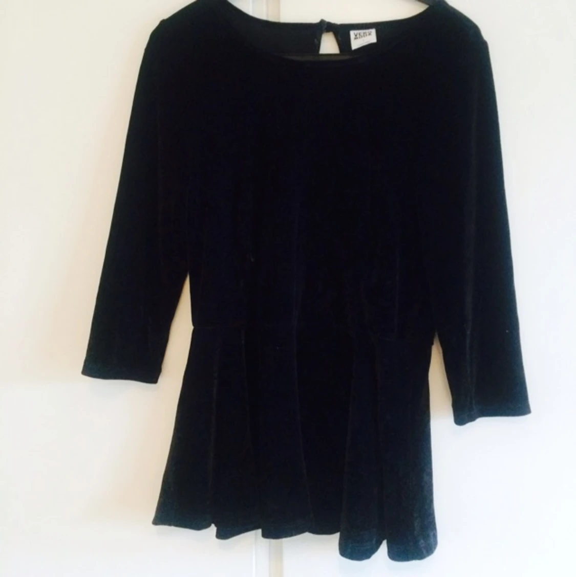 Svart peplumtopp i sammet med rosor från Vero Moda. Använd en eller två gånger, så i mycket gott skick. Knäpps med en liten knapp i nacken, trekvartsärm. Superfin! Hör av dig med frågor 😊