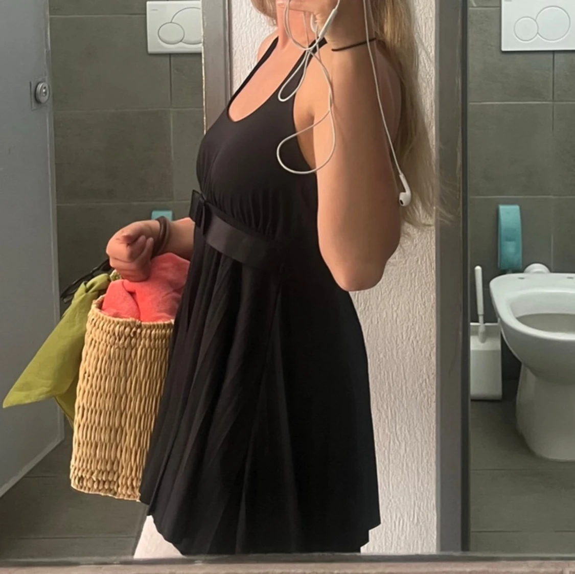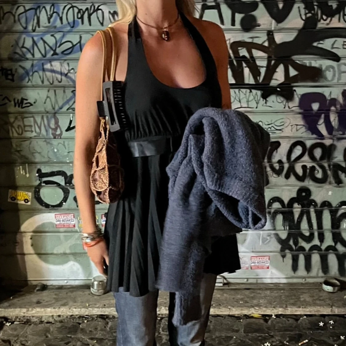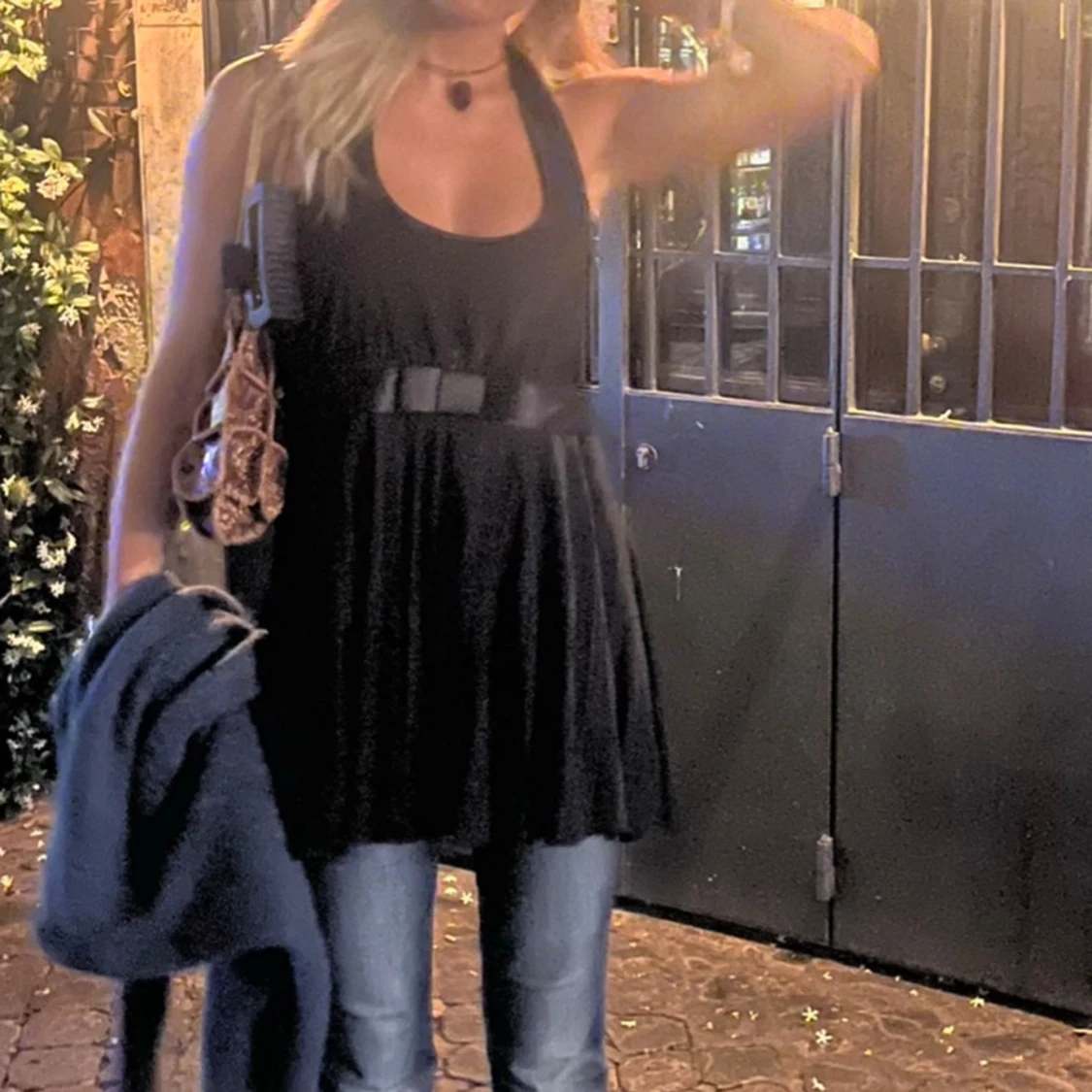 Svart halterneck topp med knyte i nacken, dragkedja på sidan och en ”rosett” framti, som ny