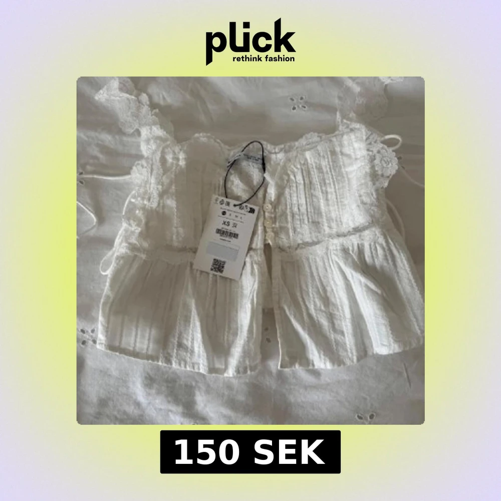 Supersöt vit blus med spetsdetaljer och knappar framtill. Axelbandslös design med romantiska volanger och broderade detaljer. Perfekt för en somrig look!