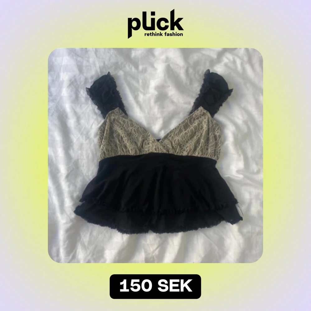 En sĂ„ söt mesh topp med spets pĂ„ bystenđ Den har som tvĂ„ lager i mesh med âruffelsâ i kanterna! Köpt pĂ„ plick bra skick men smĂ„ trĂ„dar sticker ut lite hĂ€r och dĂ€r. Varken mĂ€rke eller storlek stĂ„r men skulle gissa SđSkriv om du funderar över nĂ„gotđ