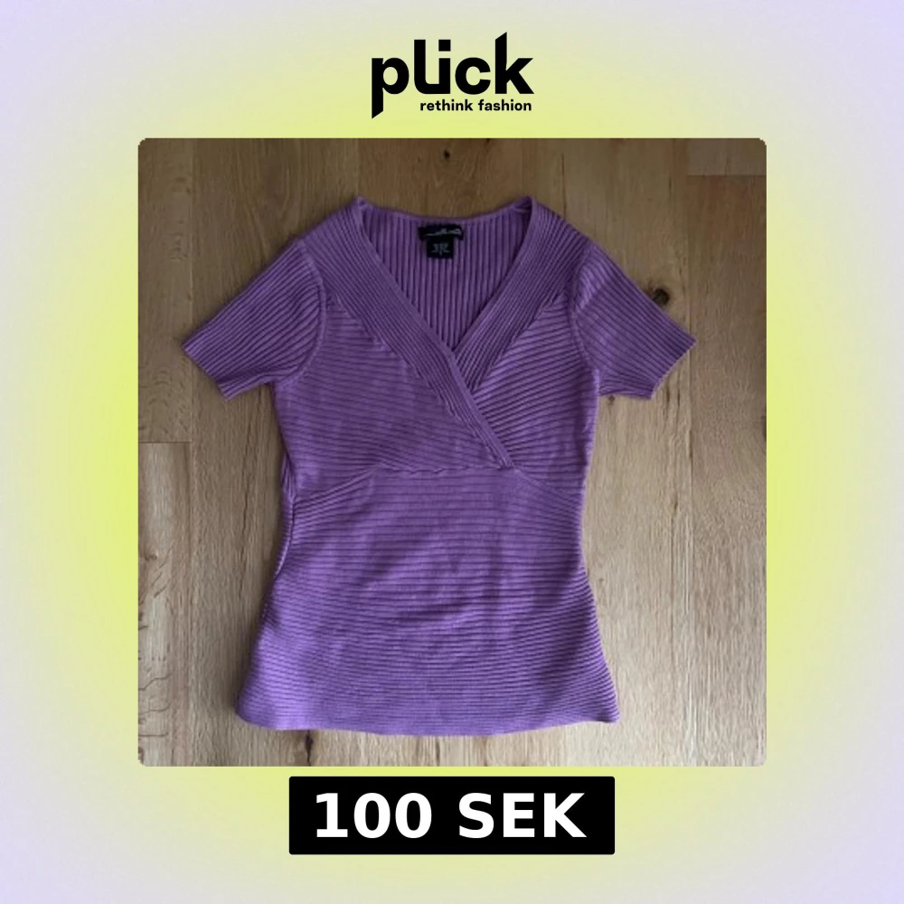 Lila tröja med korta ärmar. Köptes secondhand så vet inte hur ofta den används men har inga defekter. Säljer den då den inte är min stil längre.
