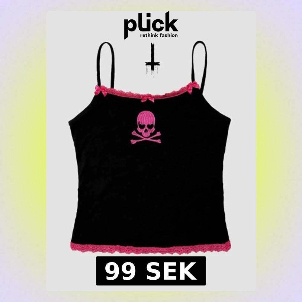 Gullig svart cami-topp med broderad dödskalle och rosa rosett/spetsdetaljer! 🩷⛓️💀Endast testad så i fint skick! ✨Storlek L, bortklippt lapp (armhåla till armhåla: 82cm) 📏Gjord i bomull så är mjuk och stretchig! Köp nu 💌