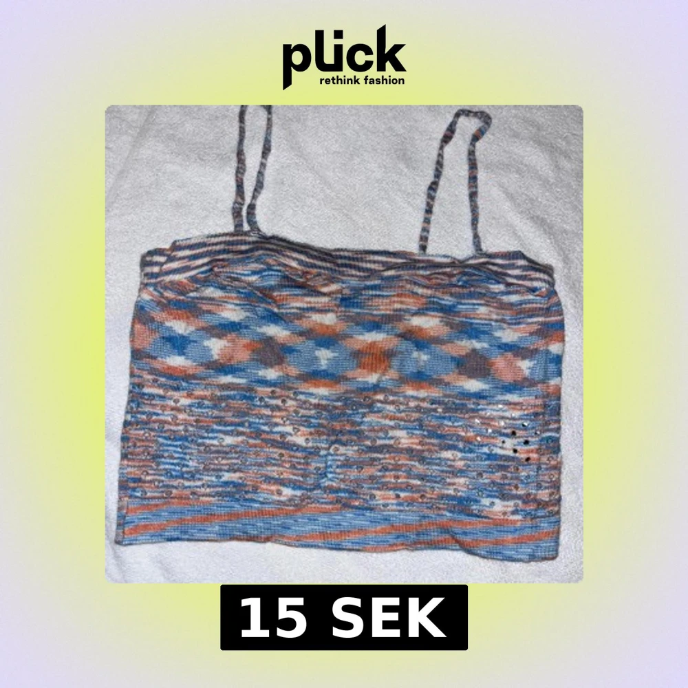 Säljer en topp med smala axelband i blått, orange och vitt. Toppen har ett unikt hålmönster nertill och ett coolt abstrakt mönster över hela plagget. Perfekt för dig som gillar färg och mönster! Helt ny