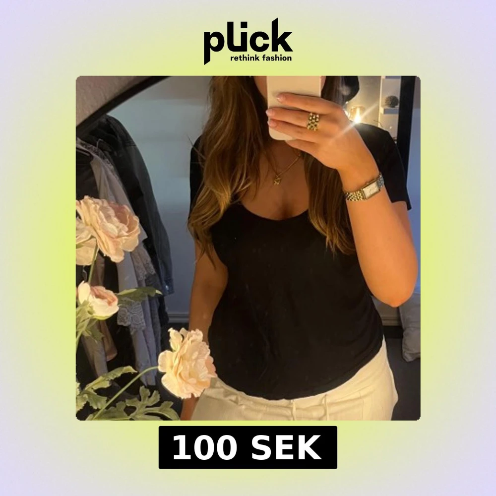 Säljer en jättesnygg svart t-shirt med lite v-ringning. Perfekt basplagg för alla tillfällen. Passar M och S storleksmässigt💌