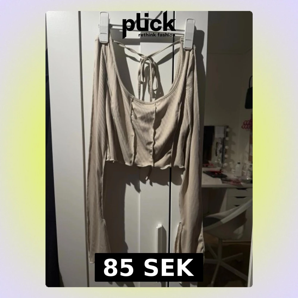 Trendig croppad topp i beige med långa ärmar och ribbad struktur. Toppen har snygg knytning i ryggen och vida ärmslut för en extra cool look. Perfekt för dig som gillar unika detaljer och vill sticka ut.