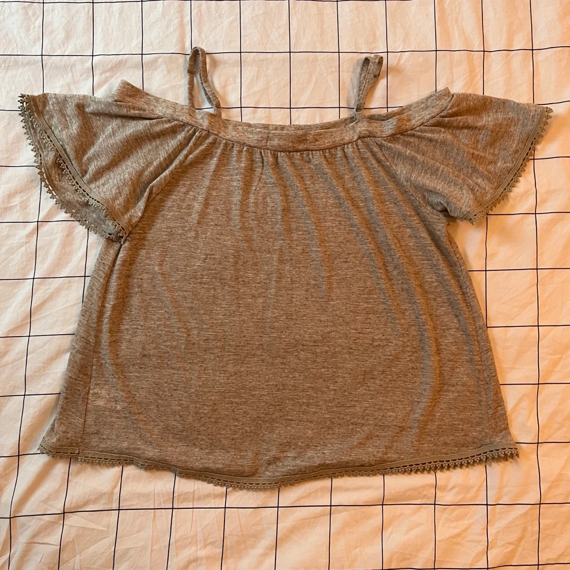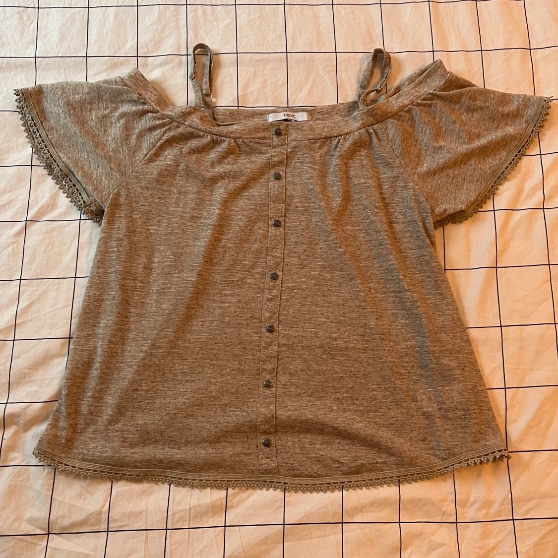 En beige topp med både axelband och ärmar, knappar i mitten. Storleken skulle jag säga passar M