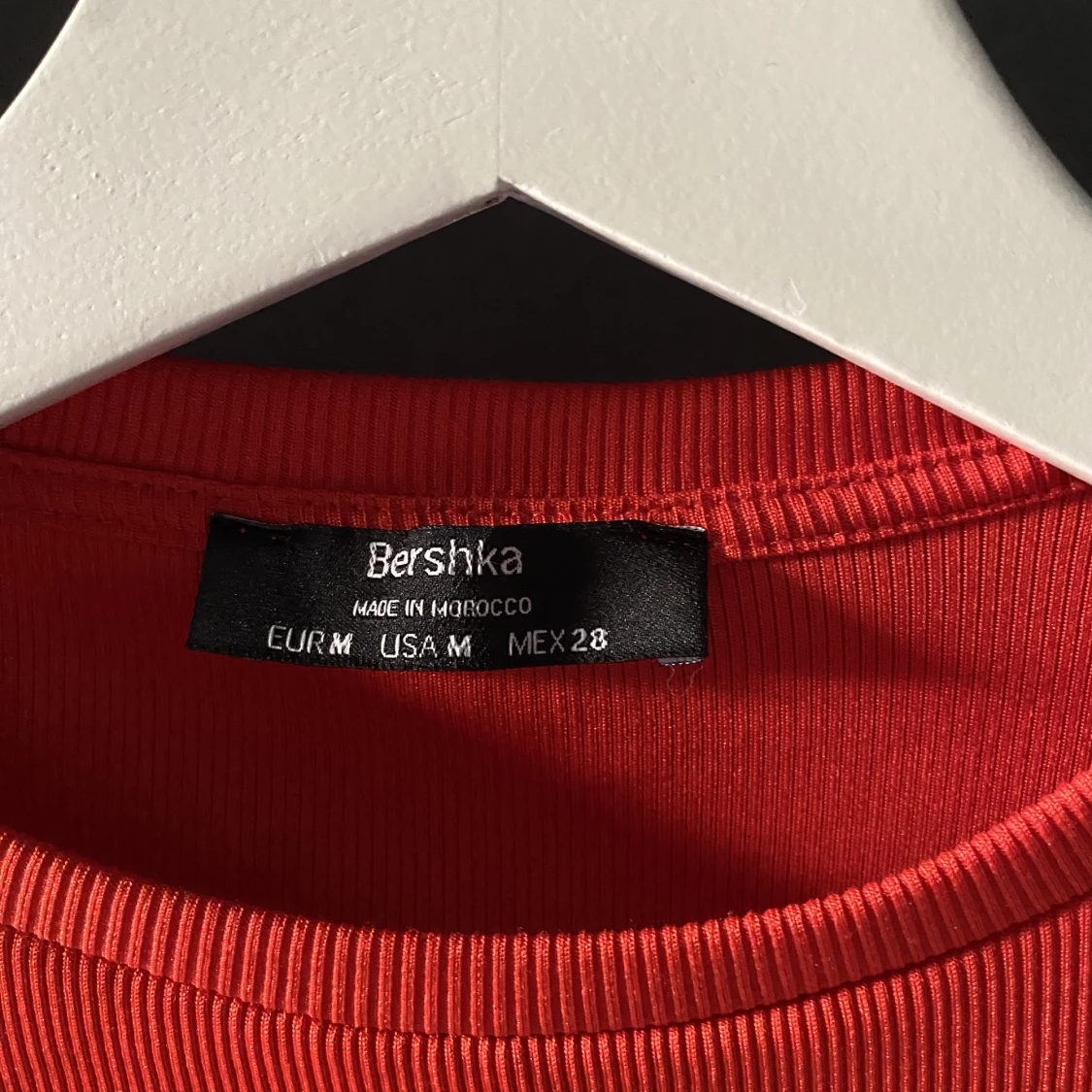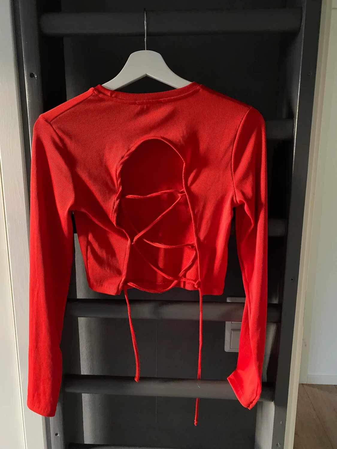 Topp med öppen rygg från Bershka. Croppad röd topp med knytning i ryggen. Storlek S, använd någon enstaka gång.