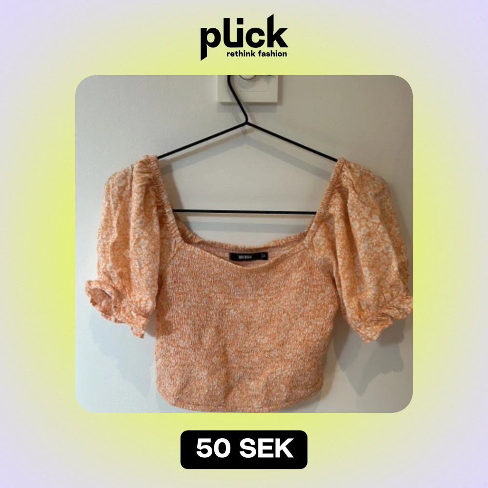 En blommig topp från Bik Bok med puffärmar och en tight passform. Toppen är i en ljus orange färg med vita blommor och har en elastisk struktur.