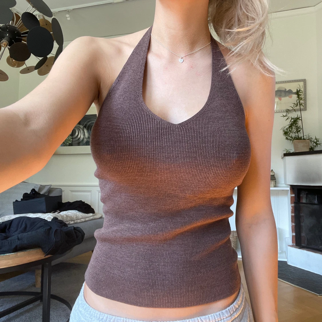 Brun halternecktopp i tunnt stickat material. Helt oanvänd med prislapp kvar. Nypris 259 kr.