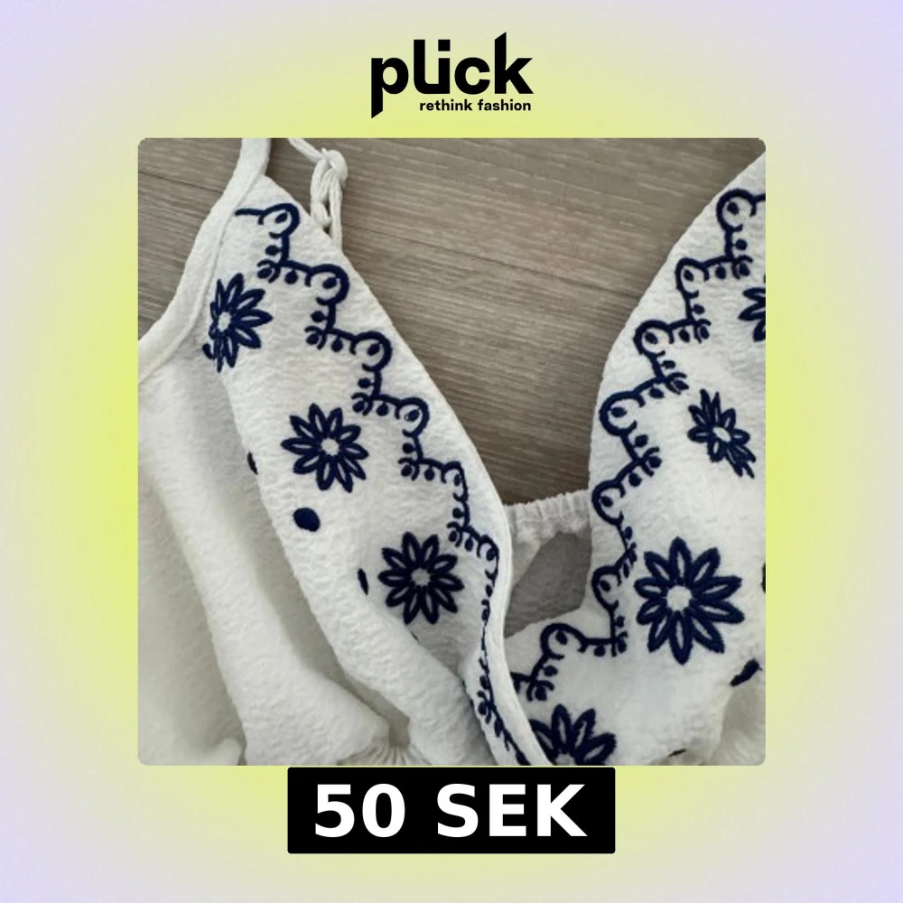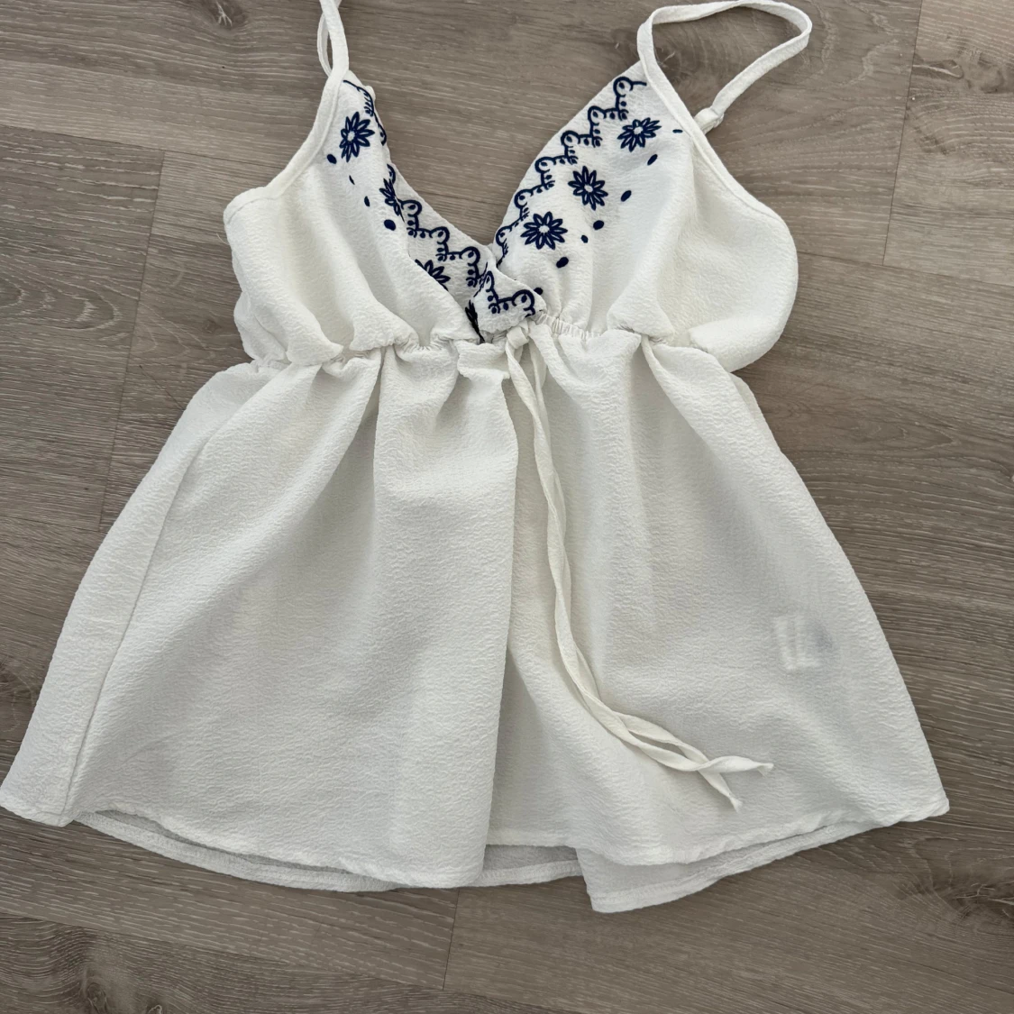 Charmig vit topp med justerbara axelband och vackert blått broderi på bröstet.