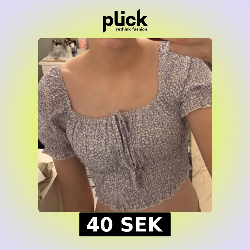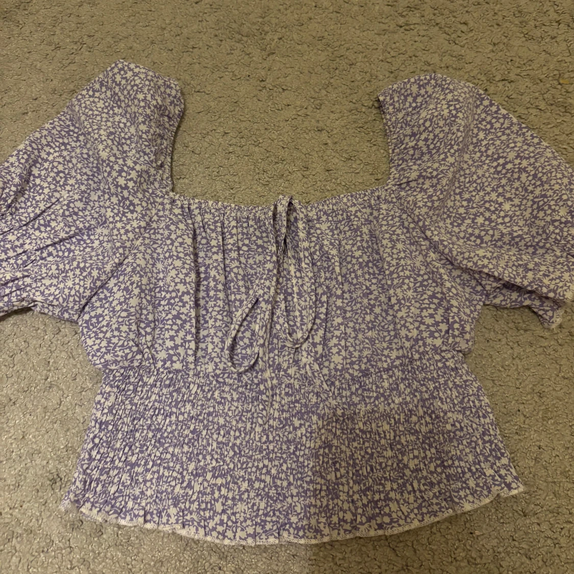 Säljer en söt lila blommig topp med korta puffärmar och knytning framtill. Toppen är croppad och har en smockad nederkant.