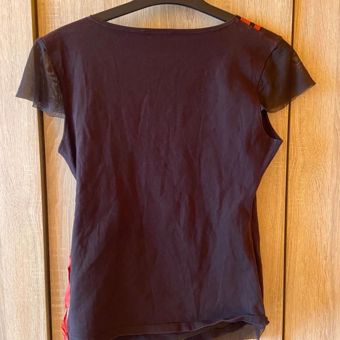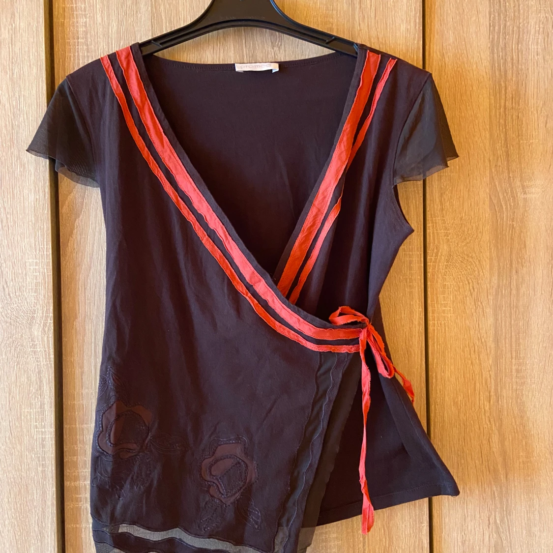 Mörkbrun crossover topp med röda detaljer som man knyter på sidan. Toppen är i nyskick förutom snöret som är lite slitet✨står ingen storlek men sitter som S-M
