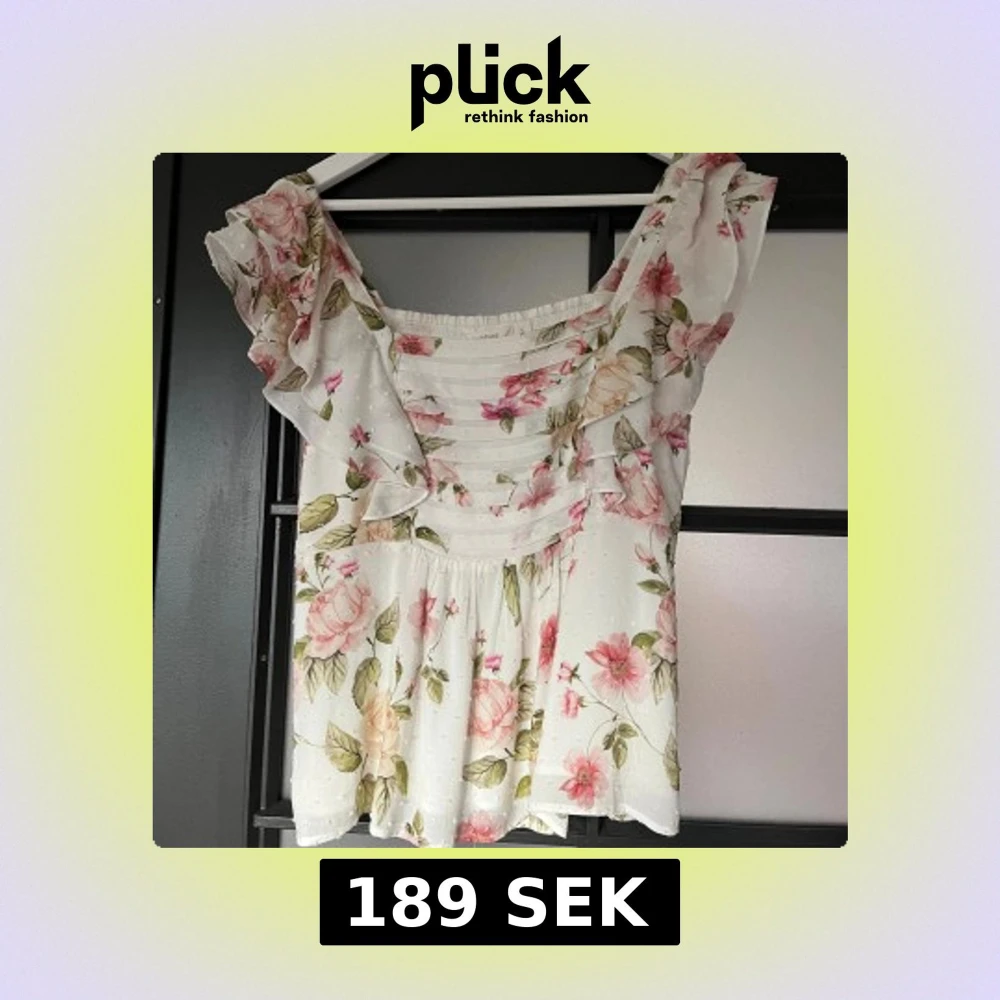 Romantisk blommig blus från Dobber i vitt med rosa och beige blommor. volangdetaljer och lätt rynk vid bysten. Tunn och luftig. Säljs i storlek S.💐