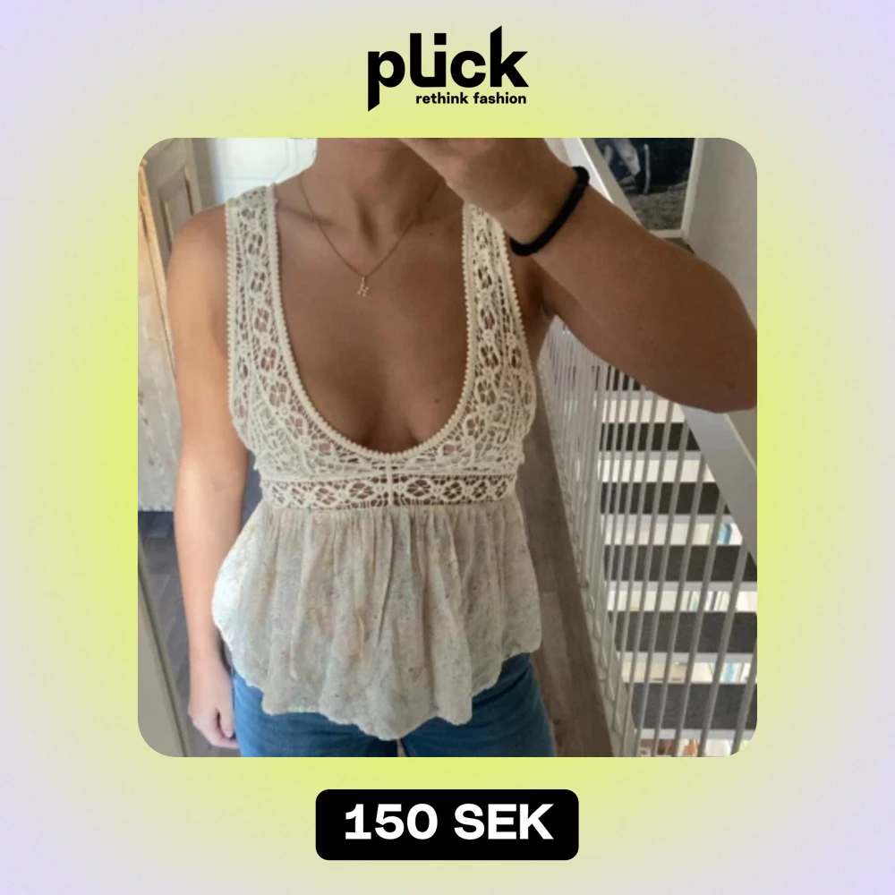 En virkad topp från zara. Färgerna blå, vit, rosa och beige på själva tyget och det virkade är också beige. Knytdetalj där bak. Knappt använd. Väldigt bra skick! Säljer för att den inte använts. Köpt för 300kr. Passar mig som är S/M💞