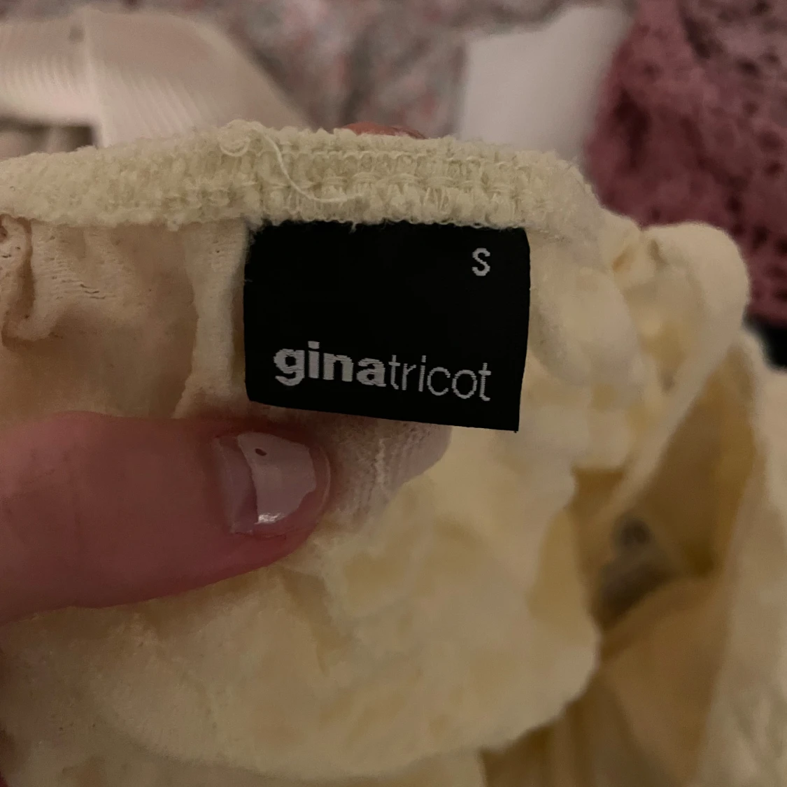 Säljer en ljusgul linnetopp från Gina Tricot med volanger och djup v-ringning. Toppen har tunna axelband och är tillverkad i ett lätt, krinklat material som ger en luftig känsla. Perfekt för varma dagar och somriga outfits. Har sytt upp banden lite då de var väldigt långa!