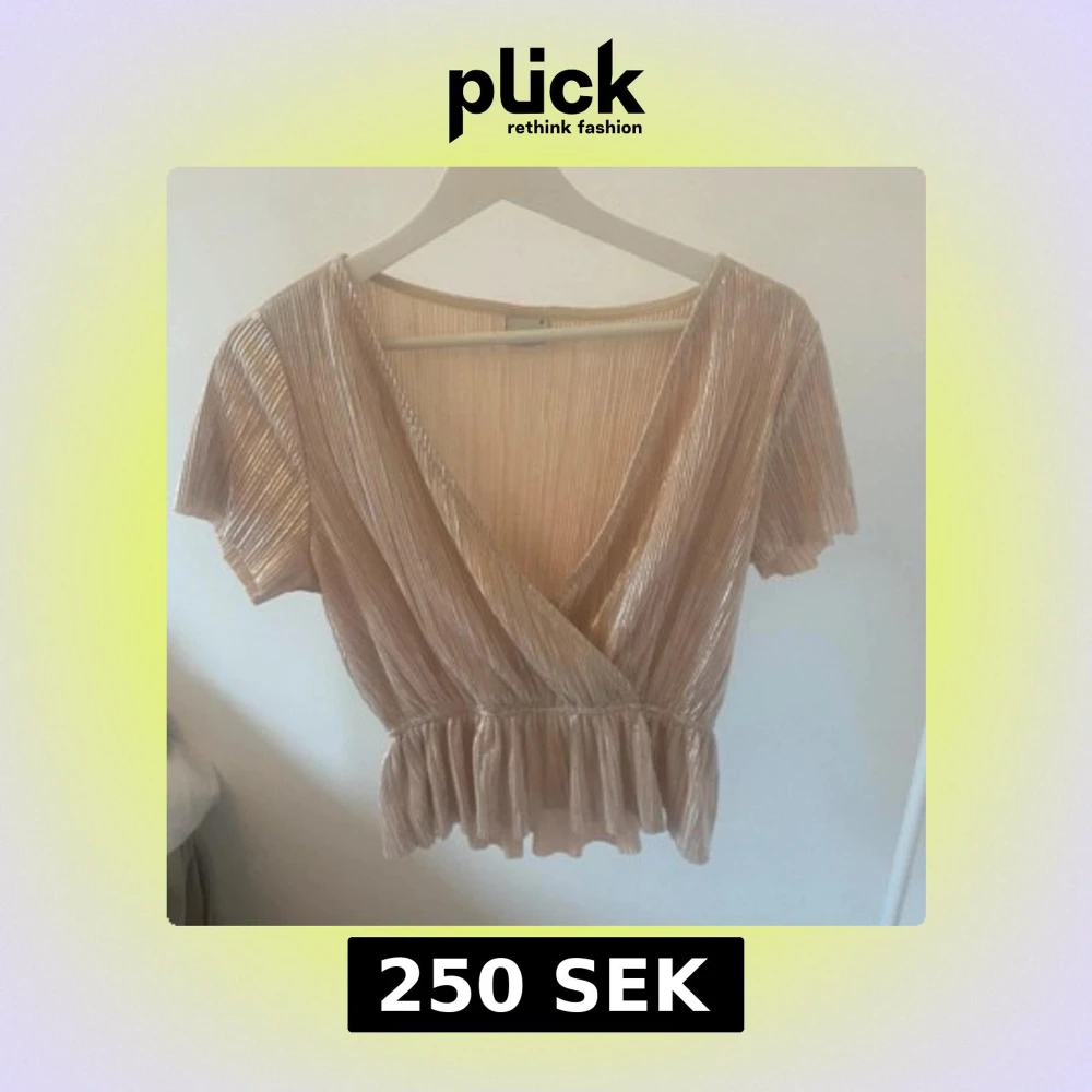 Säljer en glansig champagnefärgad omlottopp med korta ärmar och v-ringning. Toppen har plisserat tyg, volangkant nedtill och ett snyggt omlottliv som ger en feminin siluett. Perfekt för dig som gillar att sticka ut med stilrena detaljer. brukade vara långärmad men klipptes till kort