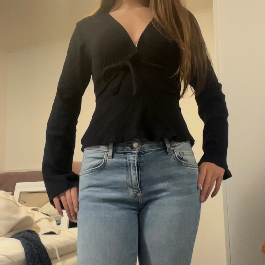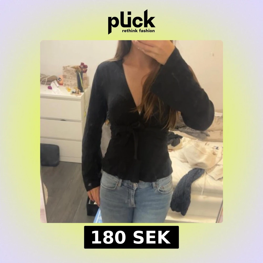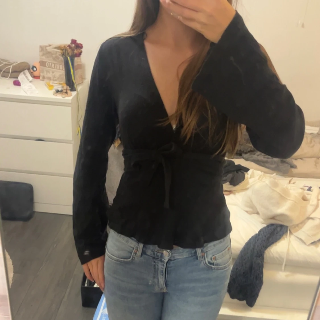 Säljer en svart omlottopp med långa ärmar och v-ringning. Toppen har ett knytband i midjan som ger en snygg siluett och är tillverkad i ett mjukt tyg. Perfekt att styla med jeans eller kjol.