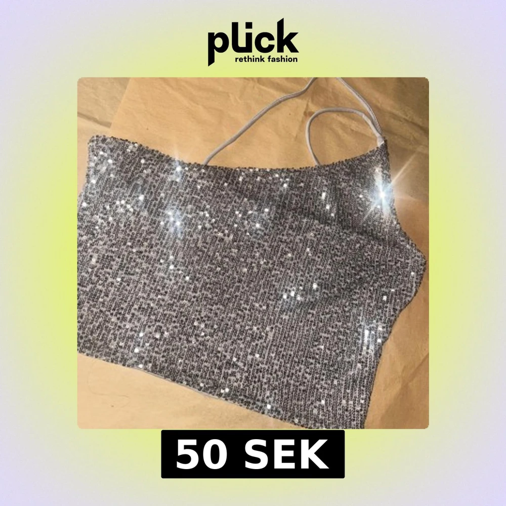 Säljer en glittrig silverfärgad topp med paljetter och smal axelrem. Toppen har en snygg one shoulder-design och är croppad, perfekt för att sticka ut. Materialet är syntet och insidan är mjukare tyg. Superfin till fest eller när du vill glänsa extra. Använd en gång
