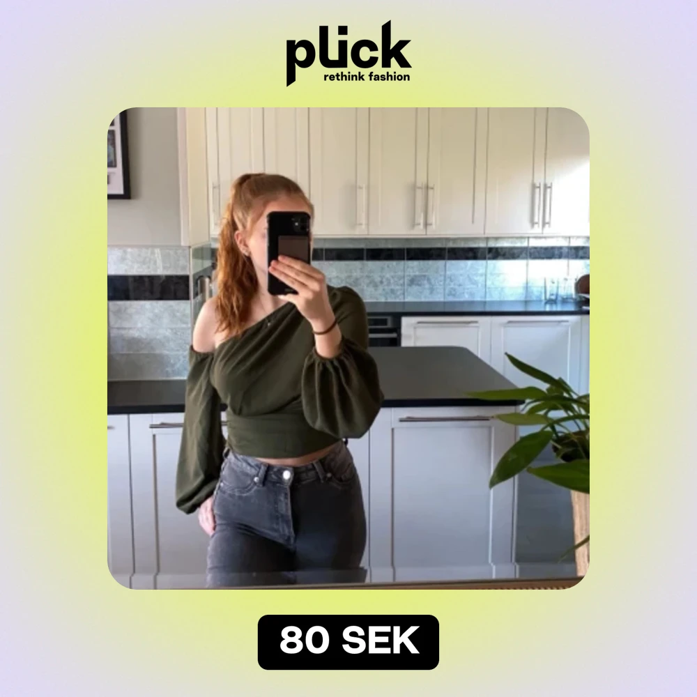Nypris 139kr, Använd en gång. Snygg olivgrön offshoulder topp med långa ärmar och en tightare midja. ä