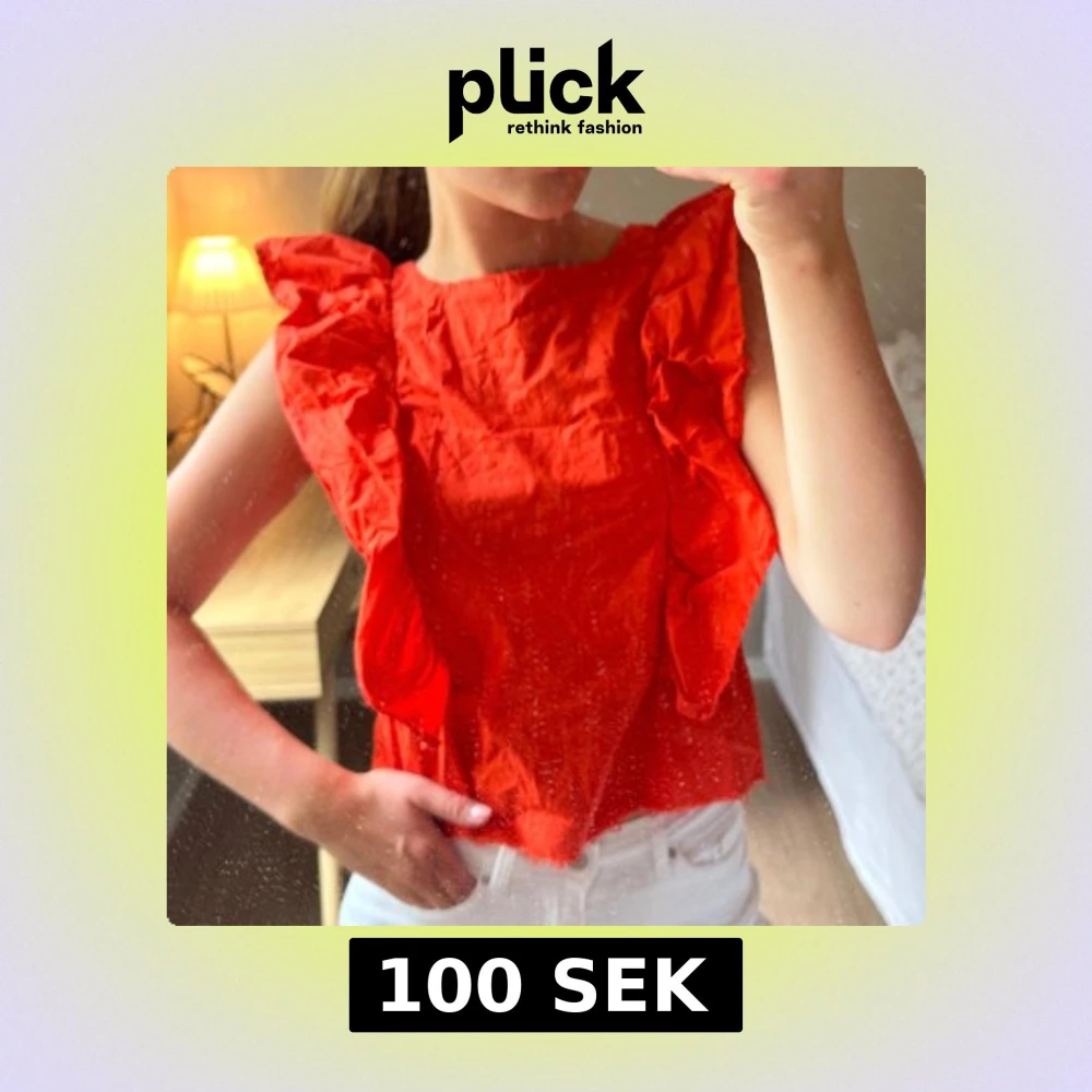 Säljer en snygg orange topp med volangdetaljer längs axlarna. Öppen rygg med rosett