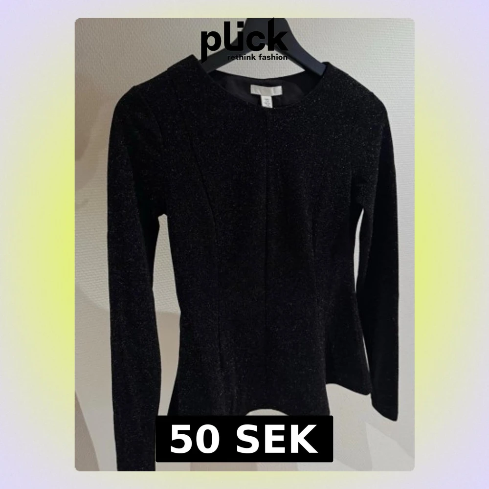 Säljer en svart långärmad topp från H&M med glittrigt tyg och figurnära passform. Toppen har rund halsringning och lätt utsvängd nederdel som ger en snygg siluett. extra.