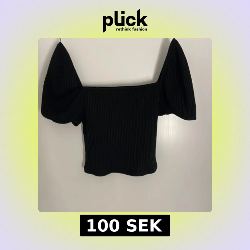 Svart ribbad topp från H&M med bred offshoulder-ringning och stora puffärmar. Toppen är croppad och har en tight passform som framhäver siluetten. Perfekt för dig som gillar trendiga detaljer och stilren look.