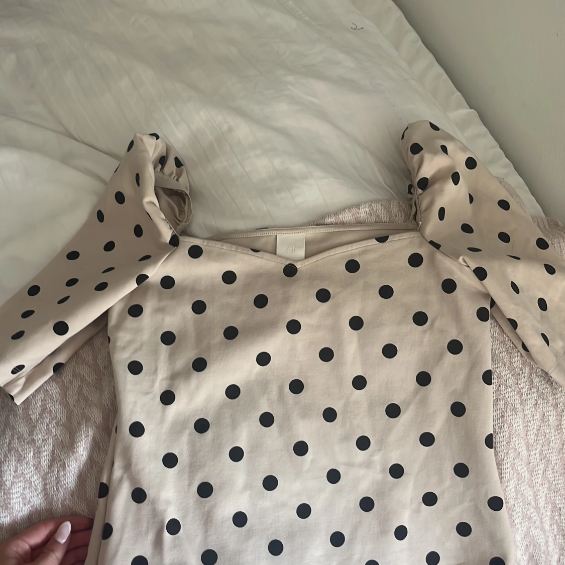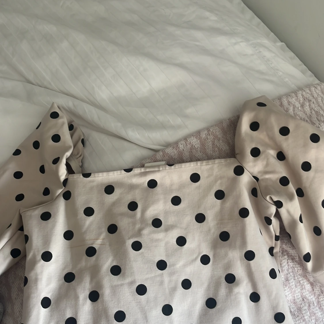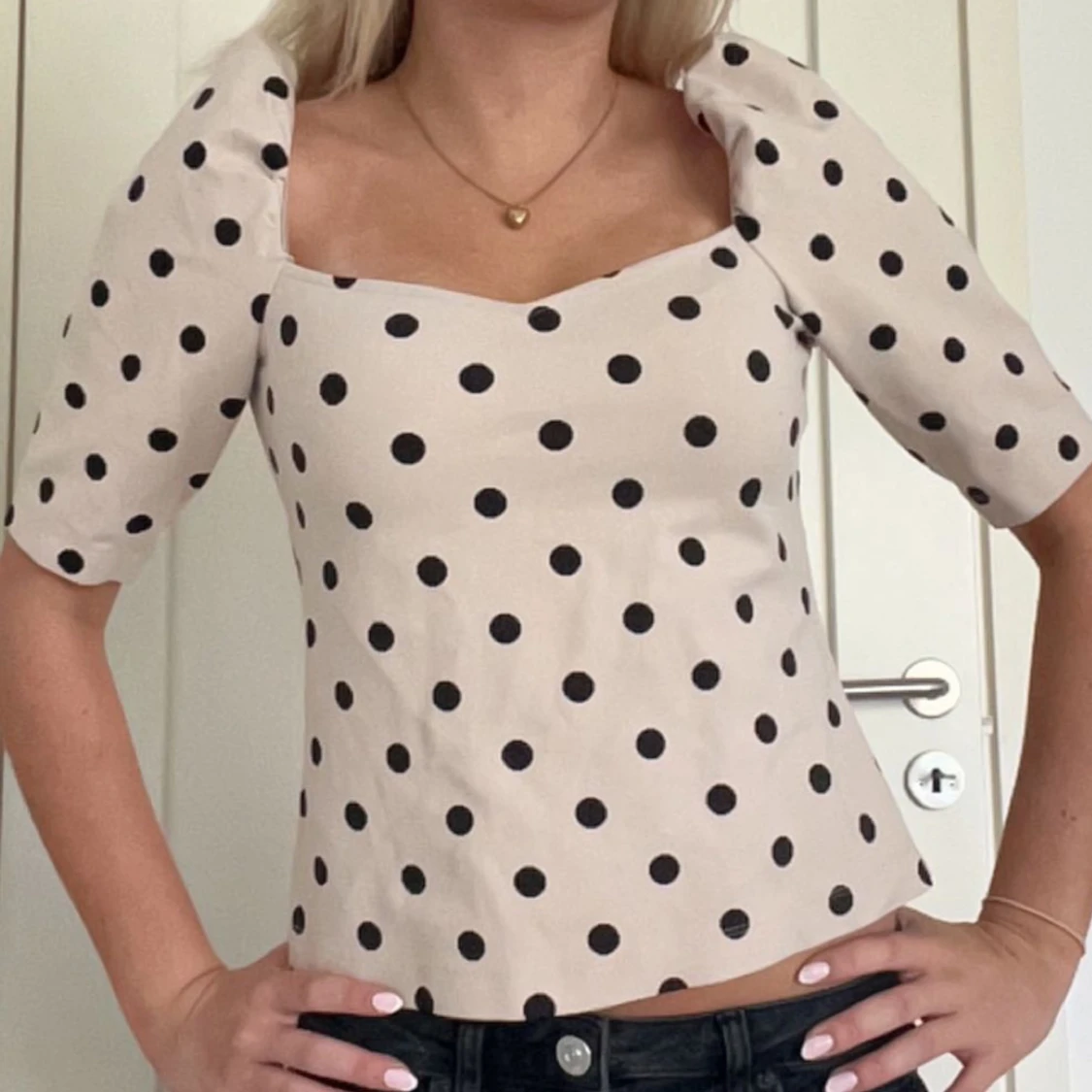 Jätte söt prickig topp med puff armar skulle säga att den är lite mer kräm vit eller bige 💕